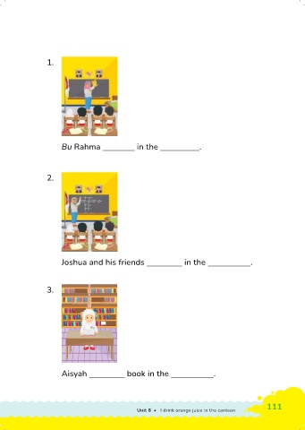 1. Bu Rahma _________ in the ___________. 2. Joshua and his friends __________ in the ____________. 3. Aisyah __________ book in the ____________. 110 Unit 8 • I drink orange juice in the canteen 111