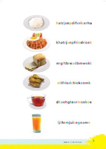 hatrjsnpdifericerha khatrjsnpfriedricek nrgftbreadbmwekl mlfriedchickenmk dkaehgtearmsekoe ljlhrmjuicegeamn 5 Unit 1 • I like Mi Aceh