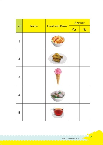 Answer No Name Food and Drink Yes No 1 2 3 4 5 7 Unit 1 • I like Mi Aceh