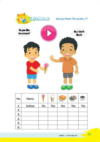 t’ s find t’ Le Le Le t’ out out out s find s find Let’s find out Ask your friend, “Do you like …?”! Do you like No, I don’t ice cream? like it No. Name 1. Joshua No Yes Yes Yes Yes 2. 3. 4. 5. 6. 15 Unit 2 • I don’t like rice
