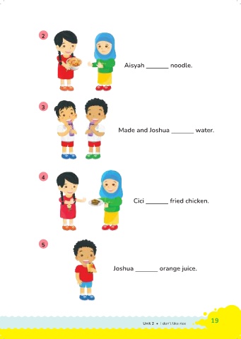 2 Aisyah ________ noodle. 3 Made and Joshua ________ water. 4 Cici ________ fried chicken. 5 Joshua ________ orange juice. 19 Unit 2 • I don’t like rice