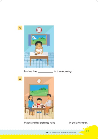 3 Joshua has ______________ in the morning. 4 Made and his parents have ____________ in the afternoon. 26 Unit 3 • I have fried chicken for breakfast 27