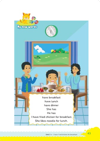 w w w ords ords w My new words My My My ne w w ords ne ne have breakfast have lunch have dinner She has He has I have fried chicken for breakfast. She likes noodle for lunch. 42 Unit 3 • I have fried chicken for breakfast 43
