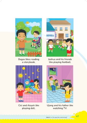 Bagas likes reading Joshua and his friends a storybook. like playing football. Cici and Aisyah like Ujang and his father like playing doll. watching TV. 46 Unit 4 • Do you like swimming? 47