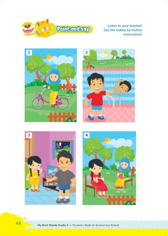 Listen to your teacher! Point and sayoint and say P oint and say P P oint and say Say the hobby by his/her instructions! 1 2 3 4 48 My Next Words Grade 3 • Student’s Book for Elementary School Unit 4 • Do you like swimming? 49