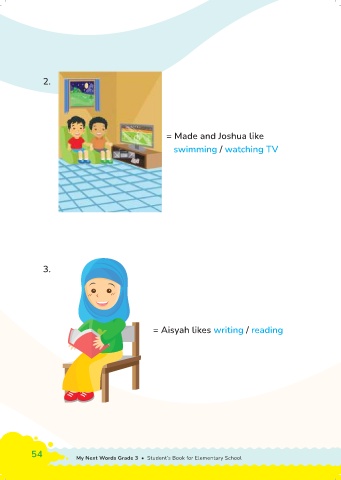 2. = Made and Joshua like swimming / watching TV 3. = Aisyah likes writing / reading 54 My Next Words Grade 3 • Student’s Book for Elementary School Unit 4 • Do you like swimming? 55
