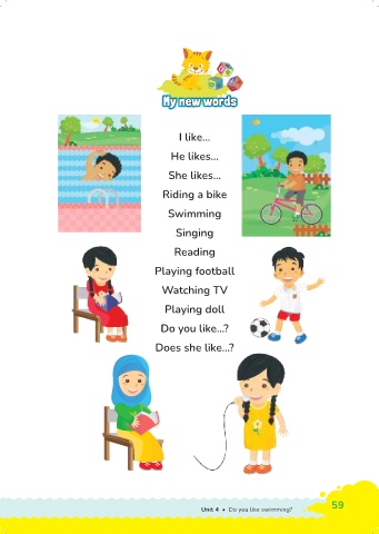 My My My ne w w ords w My new words ne ne ords ords w w w I like… He likes… She likes… Riding a bike Swimming Singing Reading Playing football Watching TV Playing doll Do you like…? Does she like…? 58 Unit 4 • Do you like swimming? 59