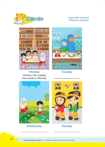 t’ s write s write t’ Let’s write Le Le Le t’ s write Look at the pictures! Write the sentence! Monday Tuesday Children like reading story book on Monday Wednesday Monday 68 My Next Words Grade 3 • Student’s Book for Elementary School 69