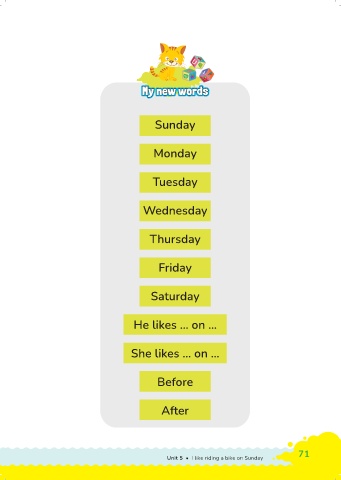 w w ne ne ords ords w w My My My ne w w ords My new words Sunday Monday Tuesday Wednesday Thursday Friday Saturday He likes … on … She likes … on … Before After 70 Unit 5 • I like riding a bike on Sunday 71