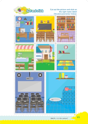 Cut and stick Cut and stick Cut and stick Cut and stick Cut out the picture and stick on the right name label! Dikerjakan pada lembar fotokopi. KANTIN BHINEKA 84 Unit 6 • Is it the canteen? 85