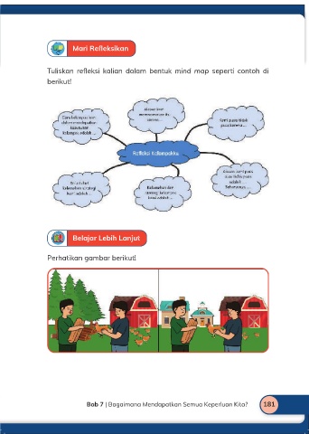 Mari Refleksikan Tuliskan refleksi kalian dalam bentuk mind map seperti contoh di berikut! Belajar Lebih Lanjut Perhatikan gambar berikut! 180 Ilmu Pengetahuan Alam dan Sosial untuk SD Kelas IV Bab 7 | Bagaimana Mendapatkan Semua Keperluan Kita? 181