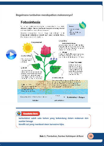 Bagaimana tumbuhan mendapatkan makanannya? Kosakata Baru karbohidrat: salah satu bahan yang terkandung dalam makanan dan sumber tenaga klorofil: zat yang membuat daun berwarna hijau Bab 1 | Tumbuhan, Sumber Kehidupan di Bumi 11