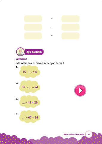 − − − Ayo Berlatih Latihan 2 Selesaikan soal di bawah ini dengan benar ! 1. 15 – … = 6 2. 37 – … = 24 3. … – 45 = 26 4. … – 67 = 24 Bab 2 | Kalimat Matematika 97