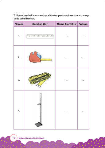 Tuliskan kembali nama setiap alat ukur panjang beserta satuannya pada tabel berikut. Nomor Gambar Alat Nama Alat Ukur Satuan 1. … … 2. … … 3. … … 4. … …. 110 Matematika untuk SD/MI Kelas III