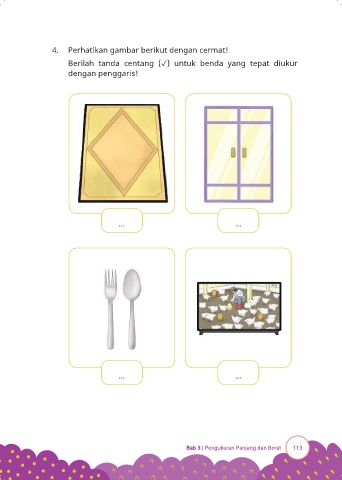 4. Perhatikan gambar berikut dengan cermat! Berilah tanda centang (✓) untuk benda yang tepat diukur dengan penggaris! ... ... ... ... Bab 3 | Pengukuran Panjang dan Berat 113