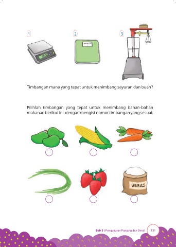 1 2 3 Timbangan mana yang tepat untuk menimbang sayuran dan buah? Pilihlah timbangan yang tepat untuk menimbang bahan-bahan makanan berikut ini, dengan mengisi nomor timbangan yang sesuai. Bab 3 | Pengukuran Panjang dan Berat 131