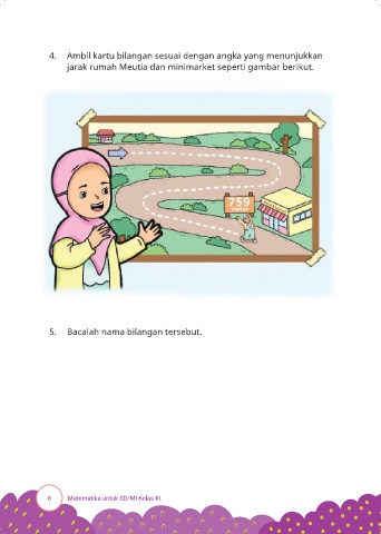 4. Ambil kartu bilangan sesuai dengan angka yang menunjukkan jarak rumah Meutia dan minimarket seperti gambar berikut. 5. Bacalah nama bilangan tersebut. 8 Matematika untuk SD/MI Kelas III