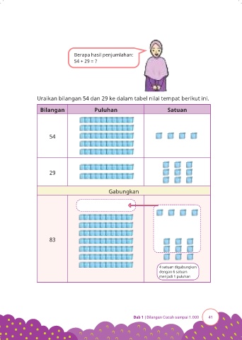 Berapa hasil penjumlahan: 54 + 29 = ? Uraikan bilangan 54 dan 29 ke dalam tabel nilai tempat berikut ini. Bilangan Puluhan Satuan 54 29 Gabungkan 83 4 satuan digabungkan dengan 6 satuan menjadi 1 puluhan Bab 1 | Bilangan Cacah sampai 1.000 41