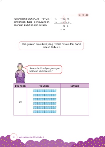 Kurangkan puluhan, 30 − 10 = 20. 45 = 30 + 15
