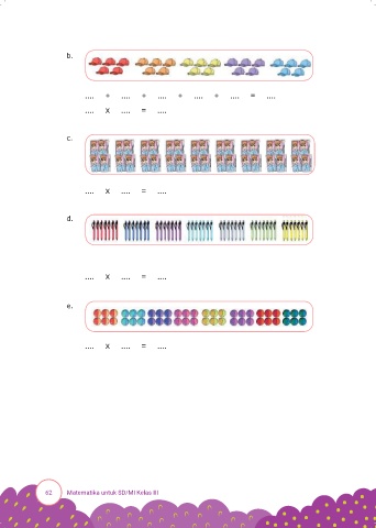 b. .... + .... + .... + .... + .... = .... .... x .... = .... c. .... x .... = .... d. .... x .... = .... e. .... x .... = .... 62 Matematika untuk SD/MI Kelas III