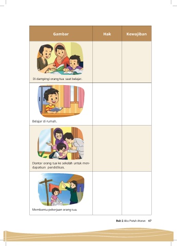 Gambar Hak Kewajiban Di dampingi orang tua saat belajar. Belajar di rumah. Diantar orang tua ke sekolah untuk men- dapatkan pendidikan. Membantu pekerjaan orang tua. Bab 2 Aku Patuh Aturan 67