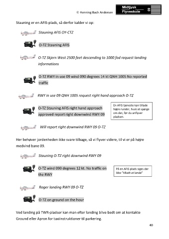 O-TZ wind 090 degrees 12 kt. No traffic on             På en AFIS plads siges der