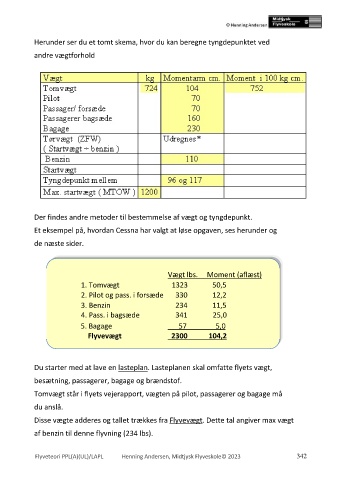 Tomvægt står i flyets vejerapport, vægten på pilot, passagerer og bagage må