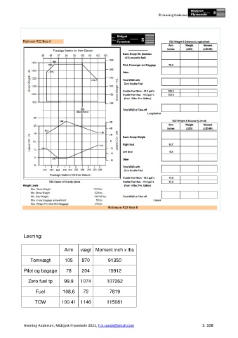 Løsning: Arm vægt Moment inch x lbs Tomvægt 105 870 91350 Pilot og bagage 78 204 15912 Zero fuel tp 99,9 1074 107262 Fuel 108,6 72 7819 TOW 100.41 1146 115081 Henning Andersen, Midtjysk Flyveskole 2021, h.b.sunds@gmail.com S. 108
