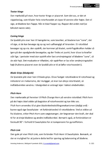 Den gule pil viser Pitch Link, som forbinder Pitch Horn til Swashplate. Bemærk, at