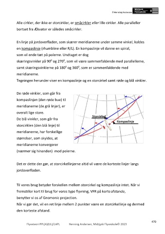 Tegningen herunder viser en kompaslinje og en storcirkel samt røde og blå vinkler.
