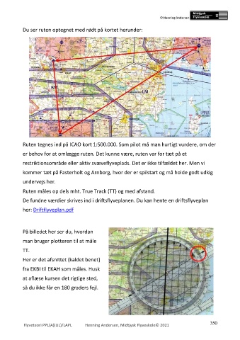 Ruten tegnes ind på ICAO kort 1:500.000. Som pilot må man hurtigt vurdere, om der