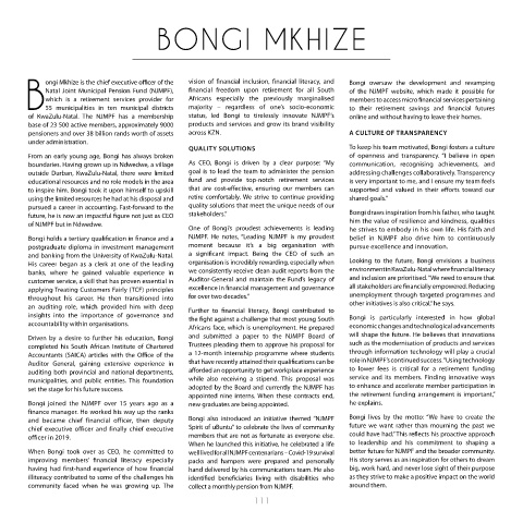 boundaries. Having grown up in Ndwedwe, a village As CEO, Bongi is driven by a clear purpose: “My communication, recognising achievements, and