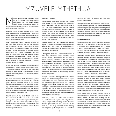 After completing school, Mzuvele enrolled at Mzuvele emphasises, “On a personal level, becom- Mzuvele is inspired by the culture at East Coast Radio,