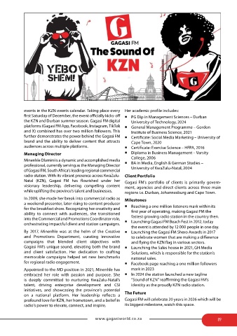 Natal (KZN), Gagasi FM has flourished under her Gagasi FM’s portfolio of clients is primarily govern-