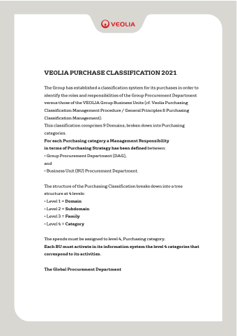 The Group has established a classification system for its purchases in order to identify the roles and responsibilities of the Group Procurement Department versus those of the VEOLIA Group Business Units (cf. Veolia Purchasing Classification Management Procedure / General Principles & Purchasing Classification Management).