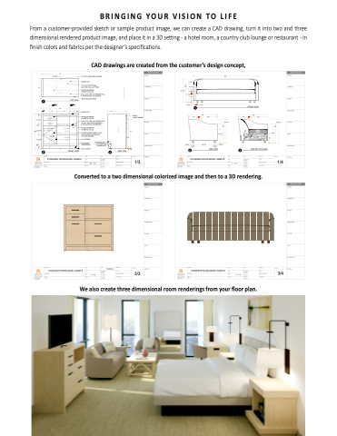 From a customer-provided sketch or sample product image, we can create a CAD drawing, turn it into two and three dimensional rendered product image, and place it in a 3D setting - a hotel room, a country club lounge or restaurant - in finish colors and fabrics per the designer’s specifications.