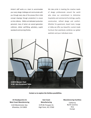 Ariston’s staff works as a team to accommodate your every design challenge and communicate with you through every step of the process (from initial concept drawings through production) to ensure on-time delivery. Skilled and dedicated production personnel, many of whom are second generation craftsmen, deliver well-fitting upholstery, superb woodwork and stunning finishes.