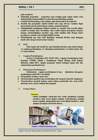 Indonesia untuk KB-1 adalah menguasai materi berbagai ragam teks dan