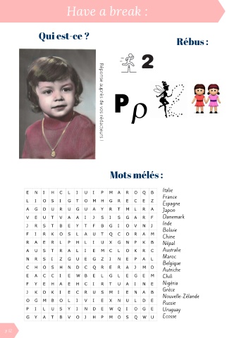 Have a break : Qui est-ce ? Rébus : P Réponse auprès de vos rédacteurs ! Mots mélés : Italie France Espagne Japon Danemark Inde Bolivie Chine Népal Australie Maroc Belgique Autriche Chili Nigéria Grèce Nouvelle-Zélande Russie Uruguay Ecosse p 12