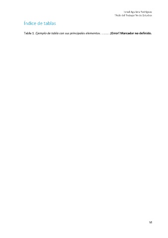 Israel Aguilera Rodríguez Título del Trabajo Fin de Estudios Índice de tablas Tabla 1. Ejemplo de tabla con sus principales elementos. .......... ¡Error! Marcador no definido. VI