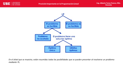 Precisión Importante en la Programación Lineal Ing. Alberto Tama Franco, MSc. Docente En el árbol que se muestra, están resumidas todas las posibilidades que se pueden presentar al resolverse un problema mediante PL.