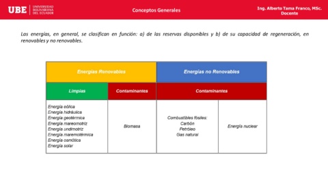 Conceptos Generales Ing. Alberto Tama Franco, MSc. Docente Las energías, en general, se clasifican en función: a) de las reservas disponibles y b) de su capacidad de regeneración, en renovables y no renovables.