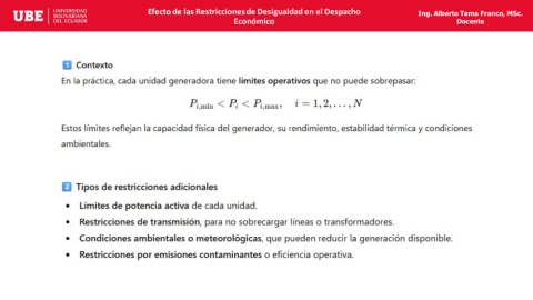 Efecto de las Restricciones de Desigualdad en el Despacho Ing. Alberto Tama Franco, MSc. Económico Docente