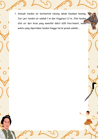 5. Sebuah tandon air berbentuk tabung dalam keadaan kosong. Jari-jari tandon air adalah 1 m dan tingginya 1,2 m. Jika tandon diisi air dari kran yang memiliki debit 628 liter/menit, maka waktu yang diperlukan tandon hingga terisi penuh adalah….