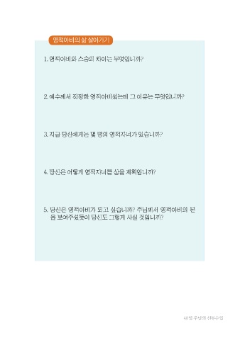 영적아비의 삶 살아가기 1. 영적아비와 스승의 차이는 무엇입니까? 2. 예수께서 진정한 영적아비셨는데 그 이유는 무엇입니까? 3. 지금 당신에게는 몇 명의 영적자녀가 있습니까? 4. 당신은 어떻게 영적자녀를 삼을 계획입니까? 5. 당신은 영적아비가 되고 싶습니까? 주님께서 영적아비의 본 을 보여주셨듯이 당신도 그렇게 사실 것입니까? 40일 주님의 신부수업
