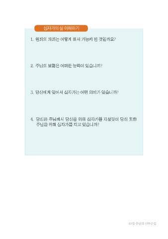십자가의 삶 이해하기 1. 원죄의 파괴는 어떻게 해서 가능케 된 것일까요? 2. 주님의 보혈은 어떠한 능력이 있습니까? 3. 당신에게 있어서 십자가는 어떤 의미가 있습니까? 4. 당신은 주님께서 당신을 위해 십자가를 지셨듯이 당신 또한 주님을 위해 십자가를 지고 있습니까? 40일 주님의 신부수업
