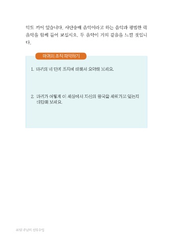 악도 끼어 있습니다. 사단숭배 음악이라고 하는 음악과 평범한 락 음악을 함께 들어 보십시오. 두 음악이 거의 같음을 느낄 것입니 다. 마귀의 조직 파악하기 1. 마귀의 네 단계 조직에 대해서 요약해 보세요. 2. 마귀가 어떻게 이 세상에서 자신의 왕국을 세워가고 있는지 대답해 보세요. 40일 주님의 신부수업