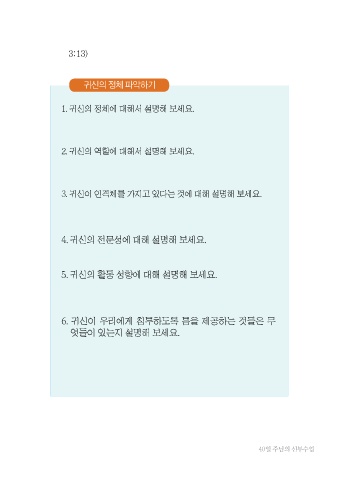 3:13) 귀신의 정체 파악하기 1. 귀신의 정체에 대해서 설명해 보세요. 2. 귀신의 역할에 대해서 설명해 보세요. 3. 귀신이 인격체를 가지고 있다는 것에 대해 설명해 보세요. 4. 귀신의 전문성에 대해 설명해 보세요. 5. 귀신의 활동 성향에 대해 설명해 보세요. 6. 귀신이 우리에게 침투하도록 틈을 제공하는 것들은 무 엇들이 있는지 설명해 보세요. 40일 주님의 신부수업