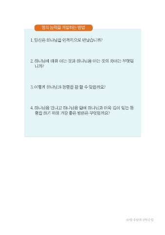 영의 능력을 개발하는 방법 1. 당신은 하나님을 인격적으로 만났습니까? 2. 하나님에 대해 아는 것과 하나님을 아는 것의 차이는 무엇입 니까? 3. 어떻게 하나님과 동행을 잘 할 수 있을까요? 4. 하나님을 만나고 하나님을 알며 하나님과 더욱 깊이 있는 동 행을 하기 위해 가장 좋은 방법은 무엇일까요? 40일 주님의 신부수업