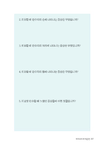 2. 치유할 때 안수자의 손에 나타나는 증상은 무엇입니까? 3. 치유할 때 안수자의 머리에 나타나는 증상은 무엇입니까? 4. 치유할 때 안수자의 몸에 나타나는 증상은 무엇입니까? 5. 지금껏 안수할 때 느꼈던 증상들에 어떤 것들입니까? 257 의의나무제자훈련_